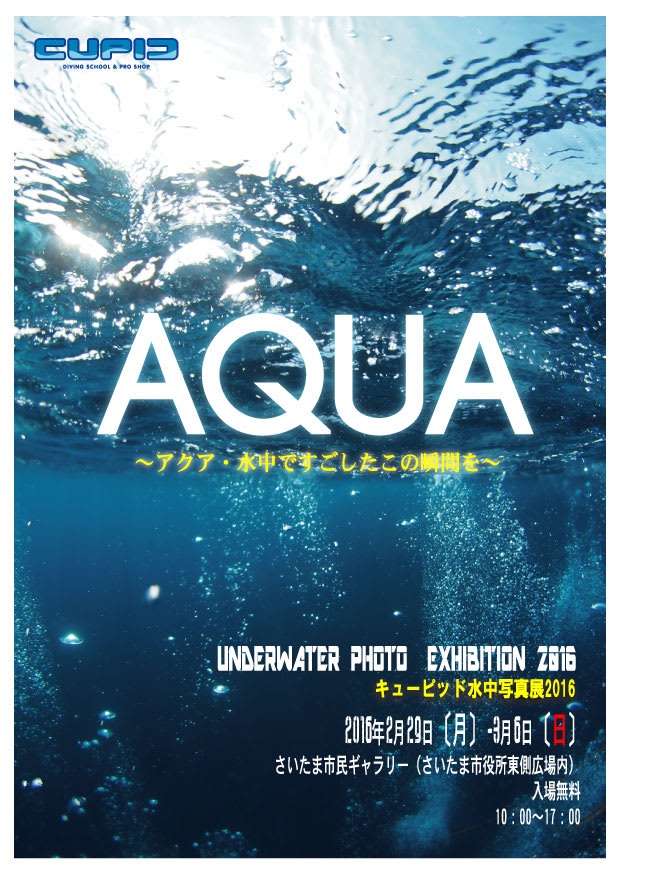 さて、知っている方もちらほらいらっしゃるかもしれませんが、2月末~3月初旬に開催されますキューピッド写真展「AQUA」がPADIのHPにアップされました