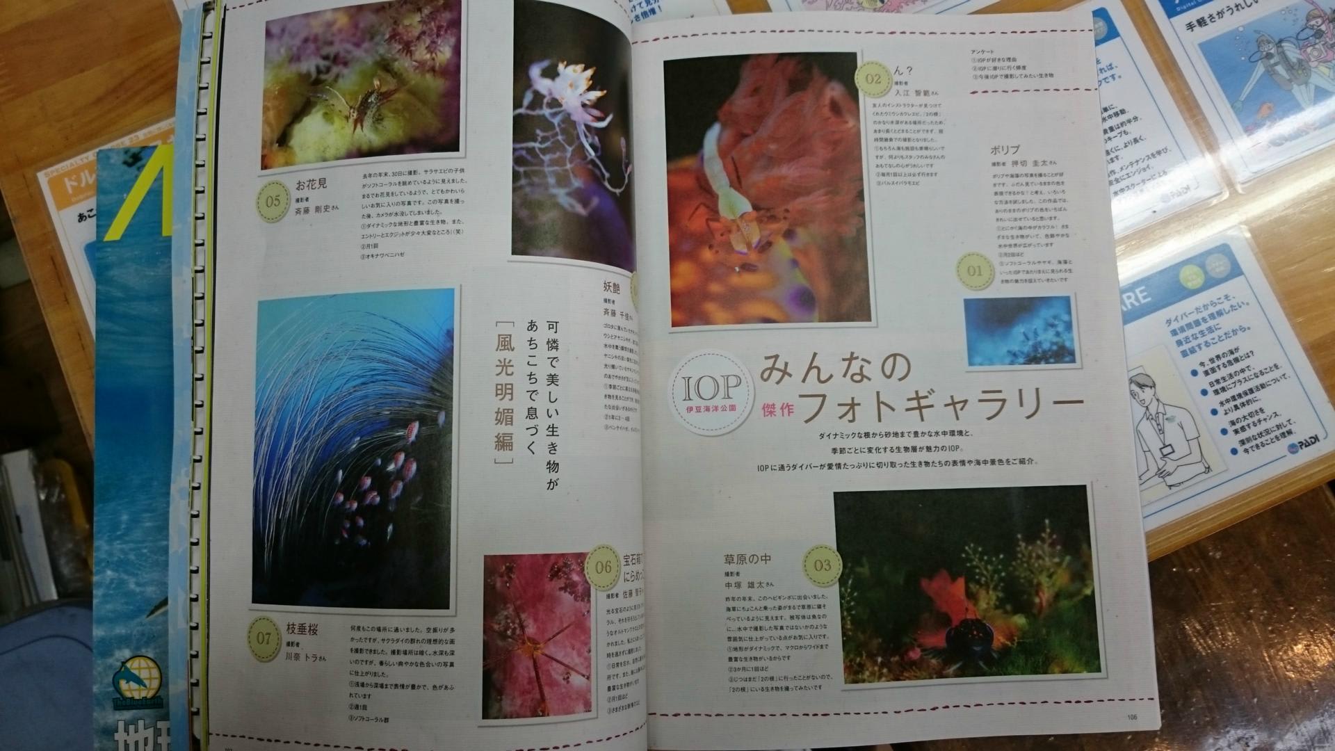 さて今月10日発売のダイビング雑誌「月刊ダイバー」のIOP(伊豆海洋公園)特集ページで、先日のIOP写真展からキューピッドのお客様(とスタッフ)の作品が4点使用されました!IOP写真展を見に来た「月刊ダイバー」の編集者の方が紙面で使いたいのでお写真を貸してほしいということで、もちろんお客様にご了解頂いて使用させていただきました。どれも素敵な作品ですね~。