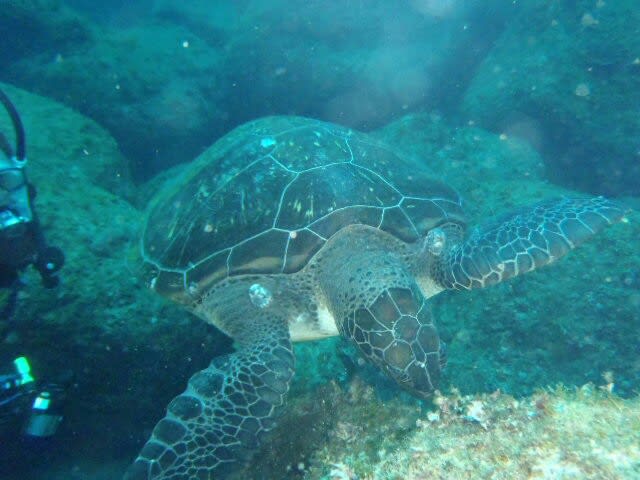 潜降してすぐウミガメ登場!サービス精神旺盛なカメで、かなり撮らせてくれました。